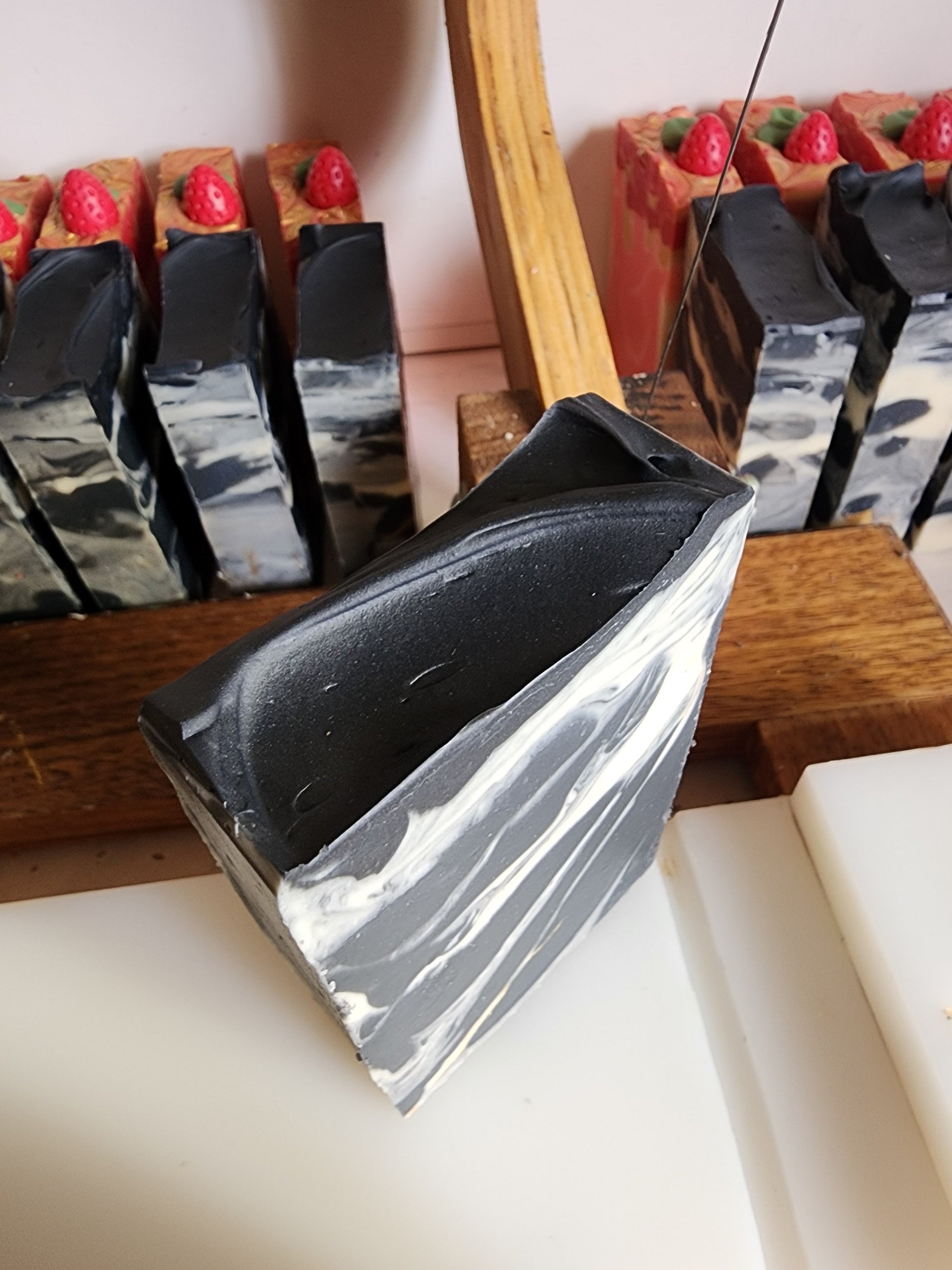 This handmade soap features activated Charcoal and a masculine scent of bergamot, cedar and leather, with a black marble design.