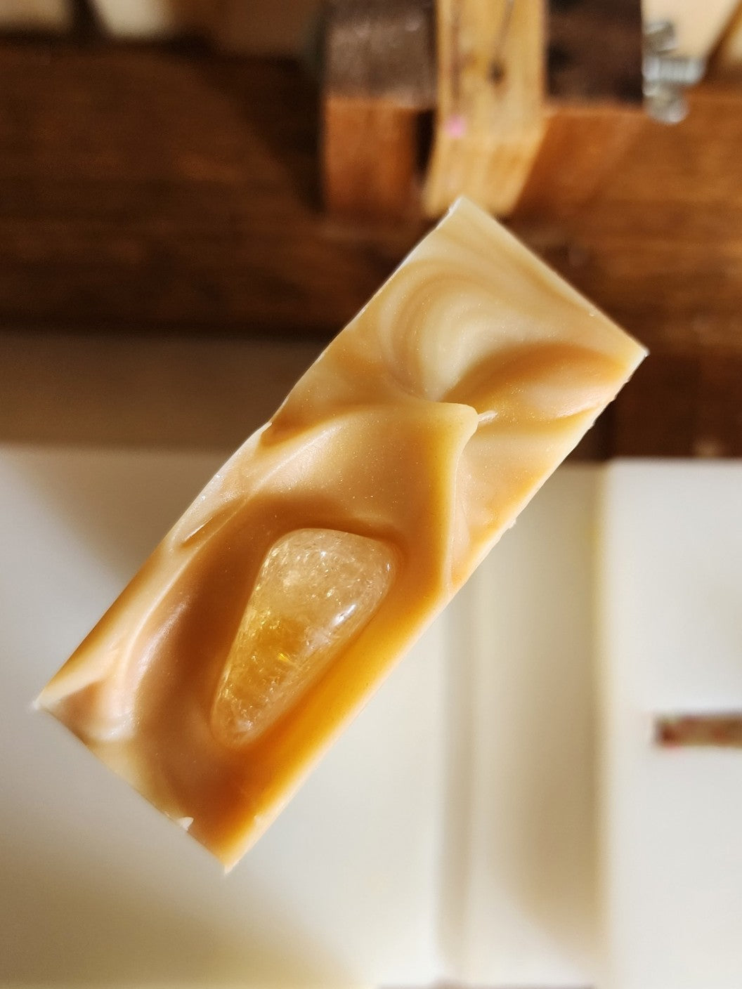 This Citrine Crystal soap has a real tumbled semi-precious citrine crystal embedded in the top, for you to keep! Scented with Citrine Sky, a soft citrusy, floral.
