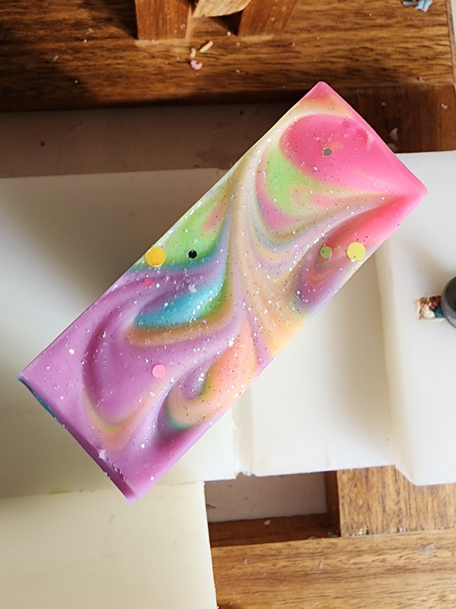 This Rainbow Sherbert scented soap is scented with a fragrance of fizzy fruits, with a creamy sweet musk finish. It's here to make all your pastel rainbow dreams in the bath come true! Topped off with a sprinkle of biodegradable glitter.